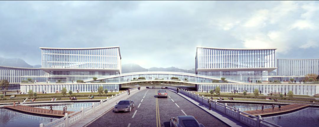 項目由四個功能獨立的建筑單體通過二層連廊緊密銜接在一起,形成一個功能齊聚的建筑主體。外立面設(shè)計靈感來自于風(fēng)琴的琴鍵、豎琴的琴弦等樂器的豎向線條及溫州的山水,營造浪漫靈動的建筑特征。通過打造下沉式廣場,使得主體建筑形體造型設(shè)計以及周邊綠化布局,完美呼應(yīng)地塊周邊優(yōu)美的山水環(huán)境,整體造型舒展蜿蜒,順應(yīng)城市格局棲于水岸。