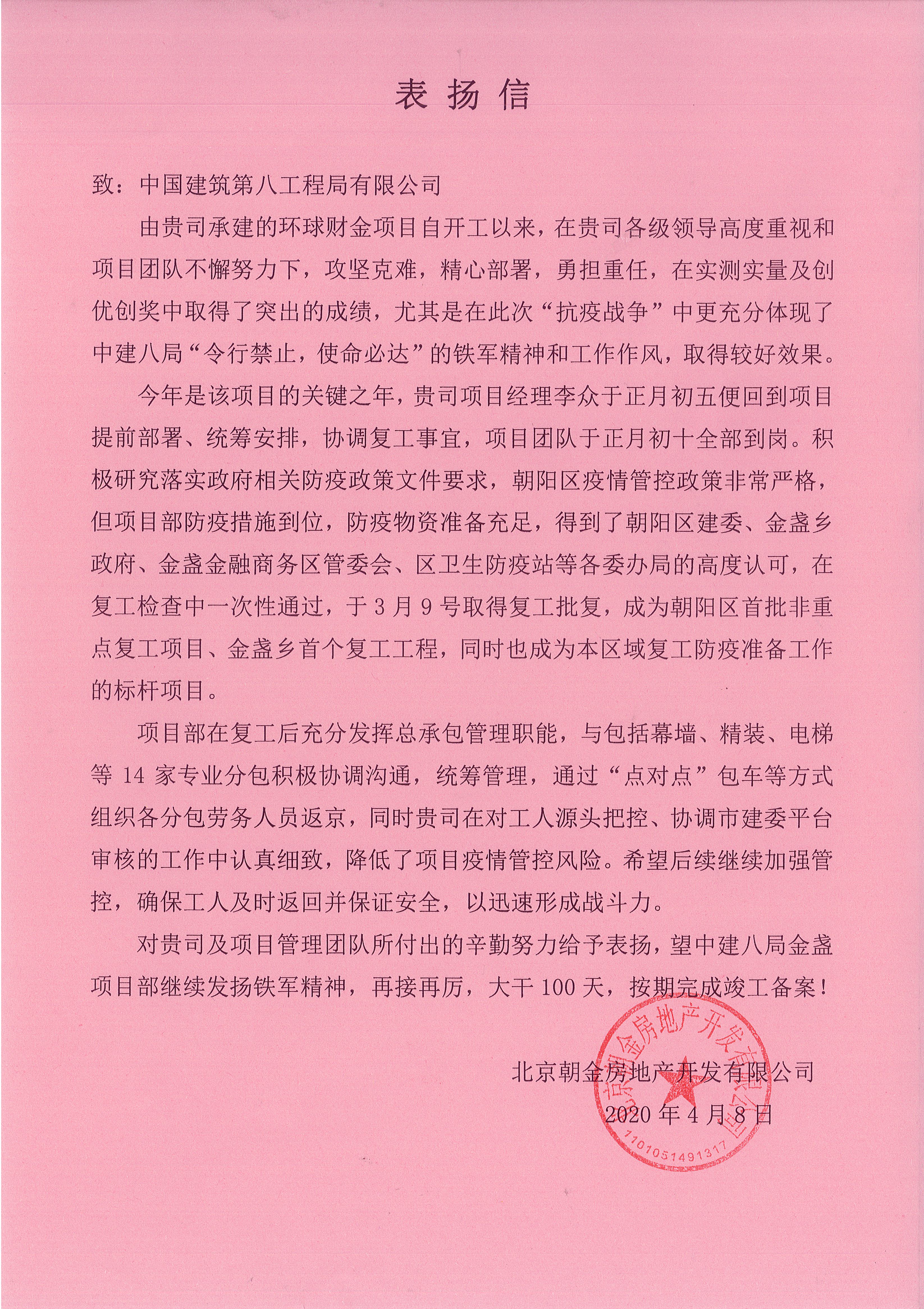 表揚信中提到,在此次抗擊疫情中,金盞項目防疫物資準備充足,疫情管控措施到位,得到了朝陽區(qū)建委、金盞鄉(xiāng)政府、金盞金融商務區(qū)管委會和區(qū)衛(wèi)生防疫站等各級單位的高度認可,在復工檢查中一次性通過,成為朝陽區(qū)首批非重點復工項目、金盞鄉(xiāng)首個復工項目,同時也成為本區(qū)域復工防疫準備工作的標桿項目,同時能夠在復工后充分發(fā)揮總承包管理職能,積極協(xié)調各參建單位。