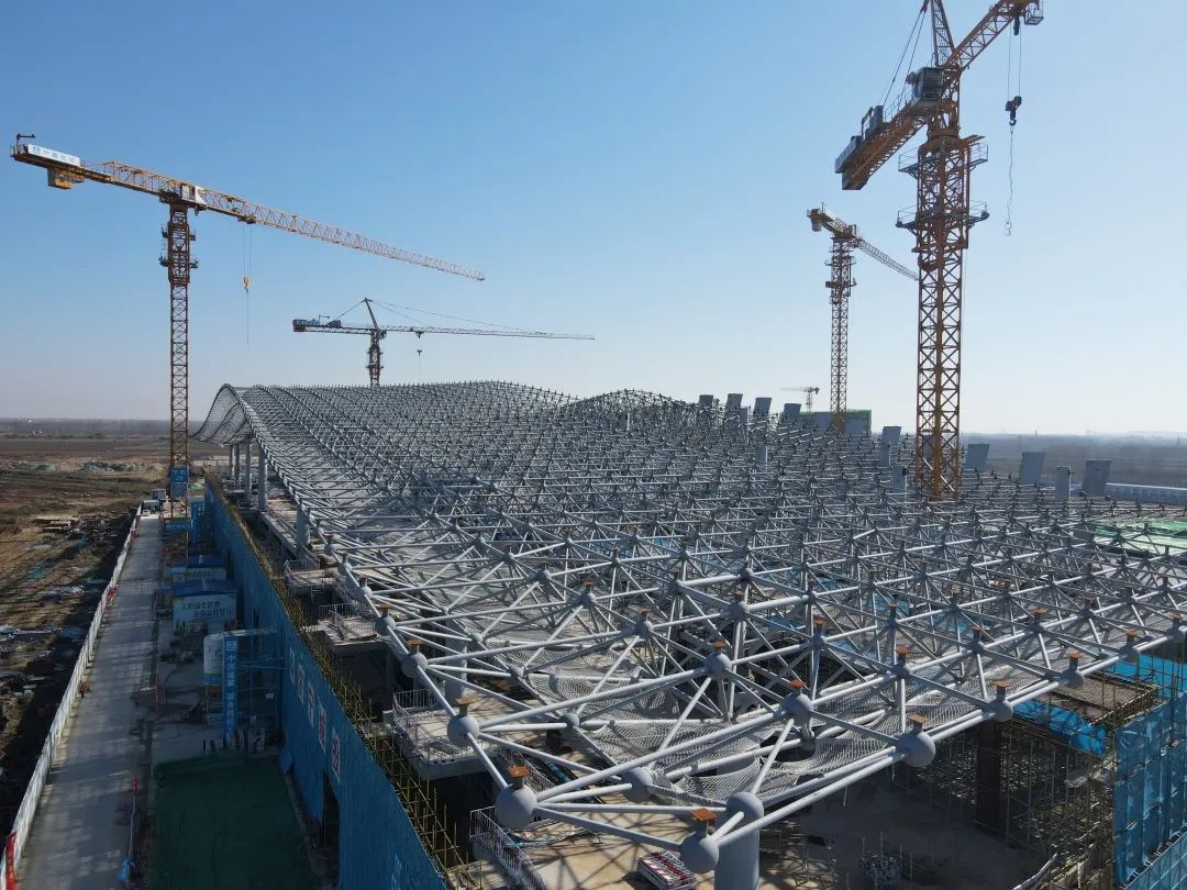 項(xiàng)目應(yīng)用智慧建造體系現(xiàn)場管理數(shù)字化、實(shí)時化、精確化,航站樓鋼網(wǎng)架屋蓋主體采用4643個焊接球、17932根桿件、網(wǎng)架重量達(dá)980.71噸、鋼結(jié)構(gòu)總用鋼量6000余噸,項(xiàng)目建立精確BIM模型,導(dǎo)入有限元力學(xué)分析軟件,測算桿件力學(xué)性能與面域受力情況,實(shí)測實(shí)量進(jìn)行偏差校核,將網(wǎng)架拼接誤差控制在毫米級,最終完美演繹機(jī)場檐面。