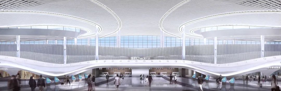 航站樓的設(shè)計(jì)理念汲取當(dāng)?shù)厣詈竦娜寮椅幕?,與獨(dú)有的運(yùn)河文化航站樓屋面造型初見,如璞玉般明潤和諧,又如祥云般蒸騰而升。項(xiàng)目從“祥云璞玉”的儒圣精神著手,暗合“君子如玉”的儒家精神,屋檐走勢如水,波浪起伏,象征著運(yùn)河文化帶來的流暢與鮮活,將古建筑“重檐屋頂、斗拱、柱列”的特點(diǎn),與現(xiàn)代機(jī)場建設(shè)相結(jié)合,典雅溫潤,渾然天成。室內(nèi)以“大成飛檐、河映孔孟”為主題,氛圍儒雅詩意,吊頂順應(yīng)天窗形式,展現(xiàn)出運(yùn)河融南匯北的壯美畫卷,運(yùn)河之都,名副其實(shí),打造濟(jì)寧獨(dú)特的儒家文化名片。
