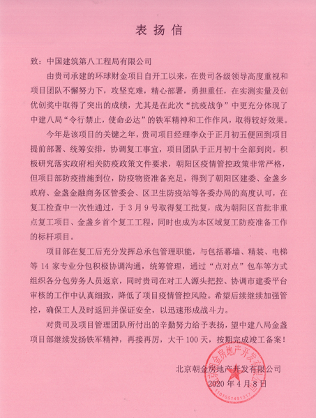 4月9日,北京金盞項目喜獲業(yè)主單位招商局地產(chǎn)發(fā)來的表揚信,信中對項目部在實測實量及創(chuàng)優(yōu)創(chuàng)獎中取得的突出成績,在“抗疫戰(zhàn)爭”中防控工作、組織復(fù)工等方面的工作給予高度評價。