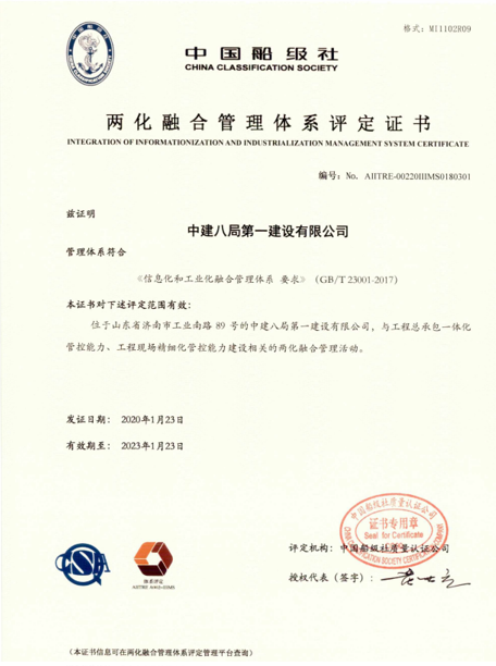 近日,中建八局一公司兩化融合管理體系通過工信部審核并公示,順利取得中國船級社頒發(fā)的《兩化融合管理體系評定證書》,評定范圍包含:工程總承包一體化管控能力、工程現(xiàn)場精細化管控能力建設相關的兩化融合管理能力。
