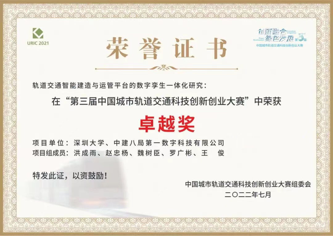 近日,第三屆中國(guó)城市軌道交通科技創(chuàng)新創(chuàng)業(yè)大賽全國(guó)總決賽暨頒獎(jiǎng)盛典在北京圓滿舉行,一公司數(shù)字科技公司與深圳大學(xué)聯(lián)合創(chuàng)新的“軌道交通智能建造與運(yùn)管平臺(tái)的數(shù)字孿生一體化研究”項(xiàng)目,榮獲總決賽基礎(chǔ)研究組最高獎(jiǎng)“卓越獎(jiǎng)”。