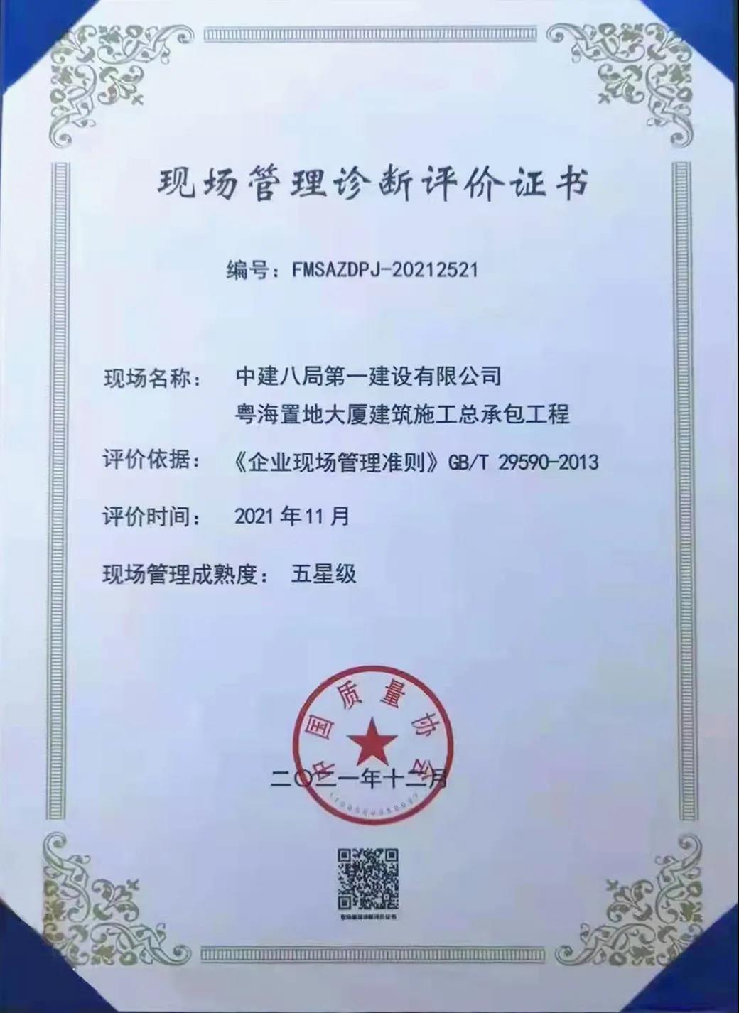 近日,中建八局一公司承建的粵海置地建筑施工總承包工程由于現(xiàn)場(chǎng)管理表現(xiàn)突出,獲中國(guó)質(zhì)量協(xié)會(huì)全國(guó)現(xiàn)場(chǎng)管理五星級(jí)評(píng)價(jià)。
