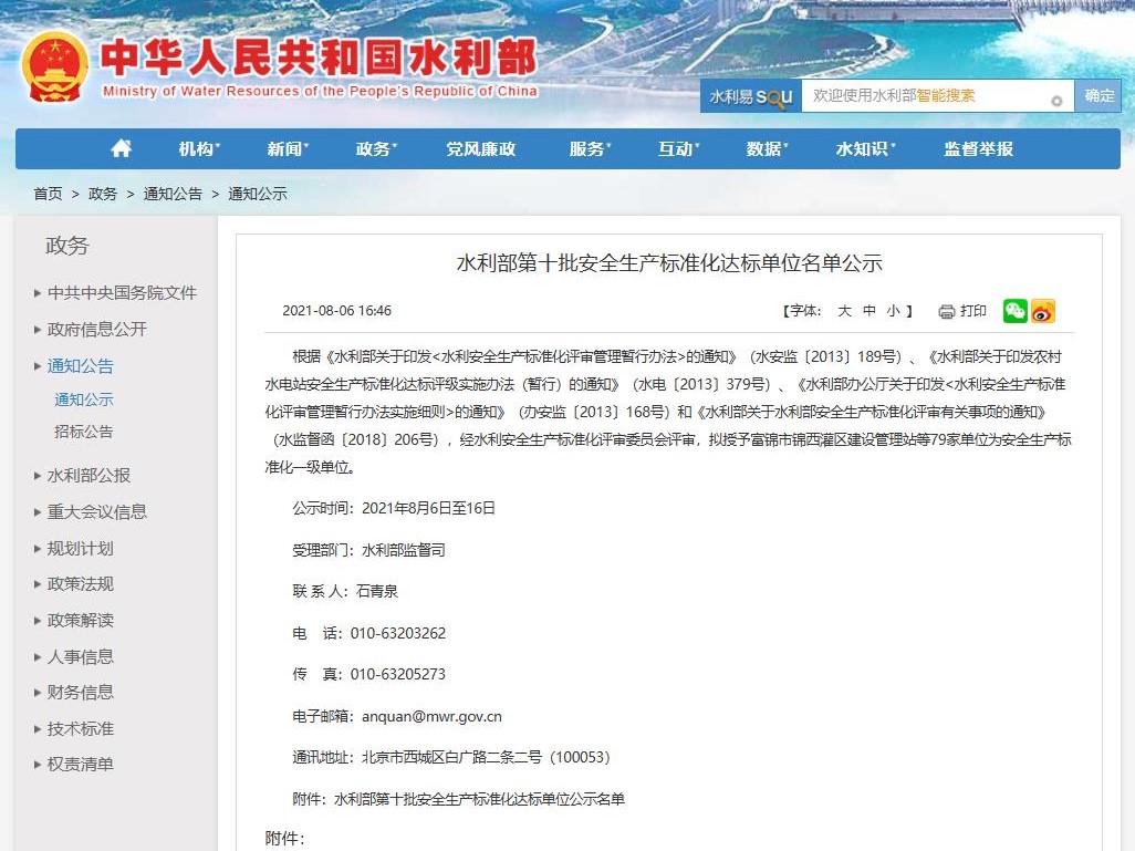 8月6日,國(guó)家水利部官網(wǎng)公示了第十批水利安全生產(chǎn)標(biāo)準(zhǔn)化達(dá)標(biāo)單位名單,中建八局一公司等79家單位認(rèn)定為水利安全生產(chǎn)標(biāo)準(zhǔn)化一級(jí)達(dá)標(biāo)單位!