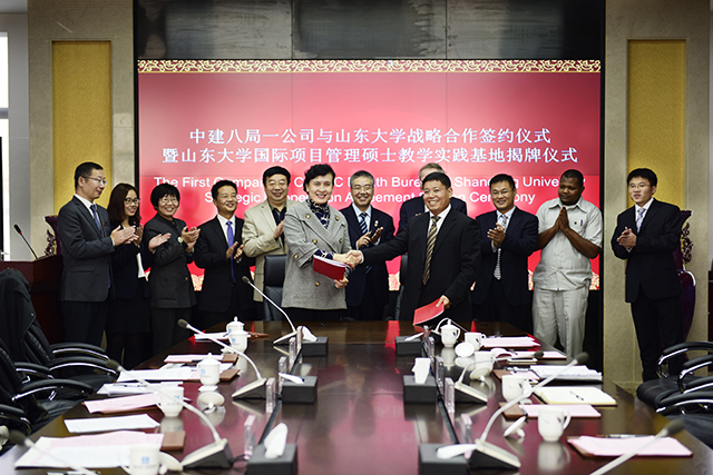 為緊密配合國家“一帶一路”戰(zhàn)略規(guī)劃,加快中國企業(yè)“走出去”的步伐,10月29日上午,公司與山東大學(xué)戰(zhàn)略合作簽約儀式暨山東大學(xué)國際項目管理碩士教學(xué)實踐基地揭牌儀式順利舉行。山東大學(xué)副校長陳子江,公司董事長、黨委書記李永明,山東大學(xué)客座教授、國際項目管理協(xié)會前任主席John Rodney Turner,山東大學(xué)管理學(xué)院書記吉小青,坦桑尼亞籍國際學(xué)生代表Yussuf Amour Ali,公司副總經(jīng)理劉明,辦公室、人力資源部、工程管理部、黨委工作部、海外事業(yè)部等負(fù)責(zé)人出席了儀式。儀式由公司黨委副書記、工會主席王有標(biāo)主持。