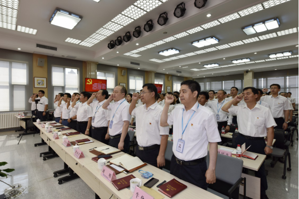 上午九點整,大會在雄壯的國歌聲中正式開始。隨后,在哈小平的領誓下,公司及各分會場黨員,面對鮮艷的中國共產黨黨旗,舉起右拳,重溫入黨誓詞。