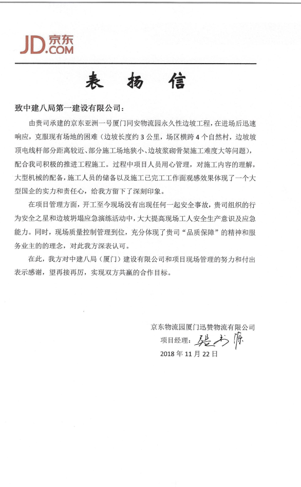 廈門京東物流園項(xiàng)目喜獲業(yè)主表揚(yáng)信