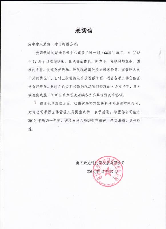 近日,南京紫光芯云中心建設(shè)工程一期G#樓項(xiàng)目,入場(chǎng)短短20天時(shí)間,喜獲業(yè)主單位表?yè)P(yáng)信。又恰逢元旦到來(lái)之際,此次表?yè)P(yáng)給予了項(xiàng)目全體員工極大的鼓舞和斗志。