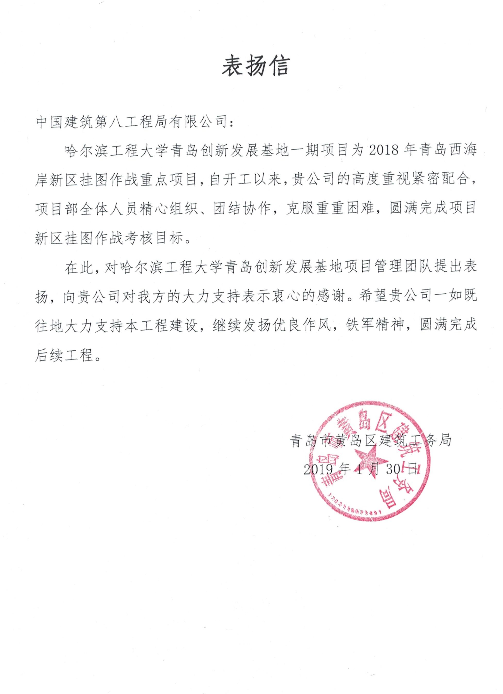 哈爾濱工程大學(xué)青島創(chuàng)新發(fā)展基地一期項(xiàng)目收到青島市黃島區(qū)建筑工務(wù)局表揚(yáng)信