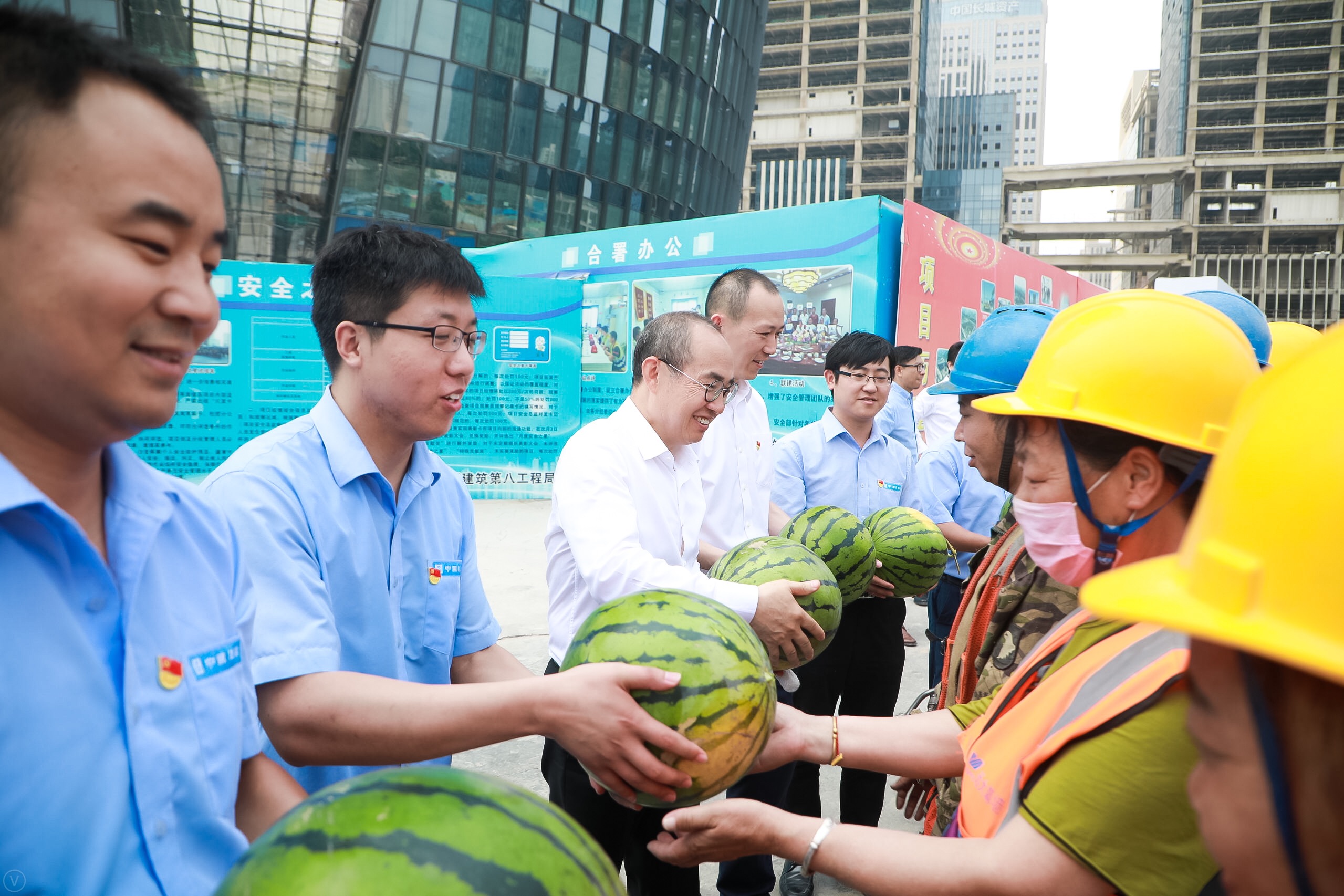 表彰大會(huì)結(jié)束后,SOHO中國(guó)各位領(lǐng)導(dǎo)與麗澤SOHO項(xiàng)目管理團(tuán)隊(duì)合影留念。同時(shí)為傳遞對(duì)一線職工的關(guān)懷與關(guān)愛(ài),麗澤SOHO項(xiàng)目黨支部精心組織了夏日“送清涼”活動(dòng),黨支部邀請(qǐng)潘石屹、王濤一起為農(nóng)民工兄弟發(fā)西瓜。