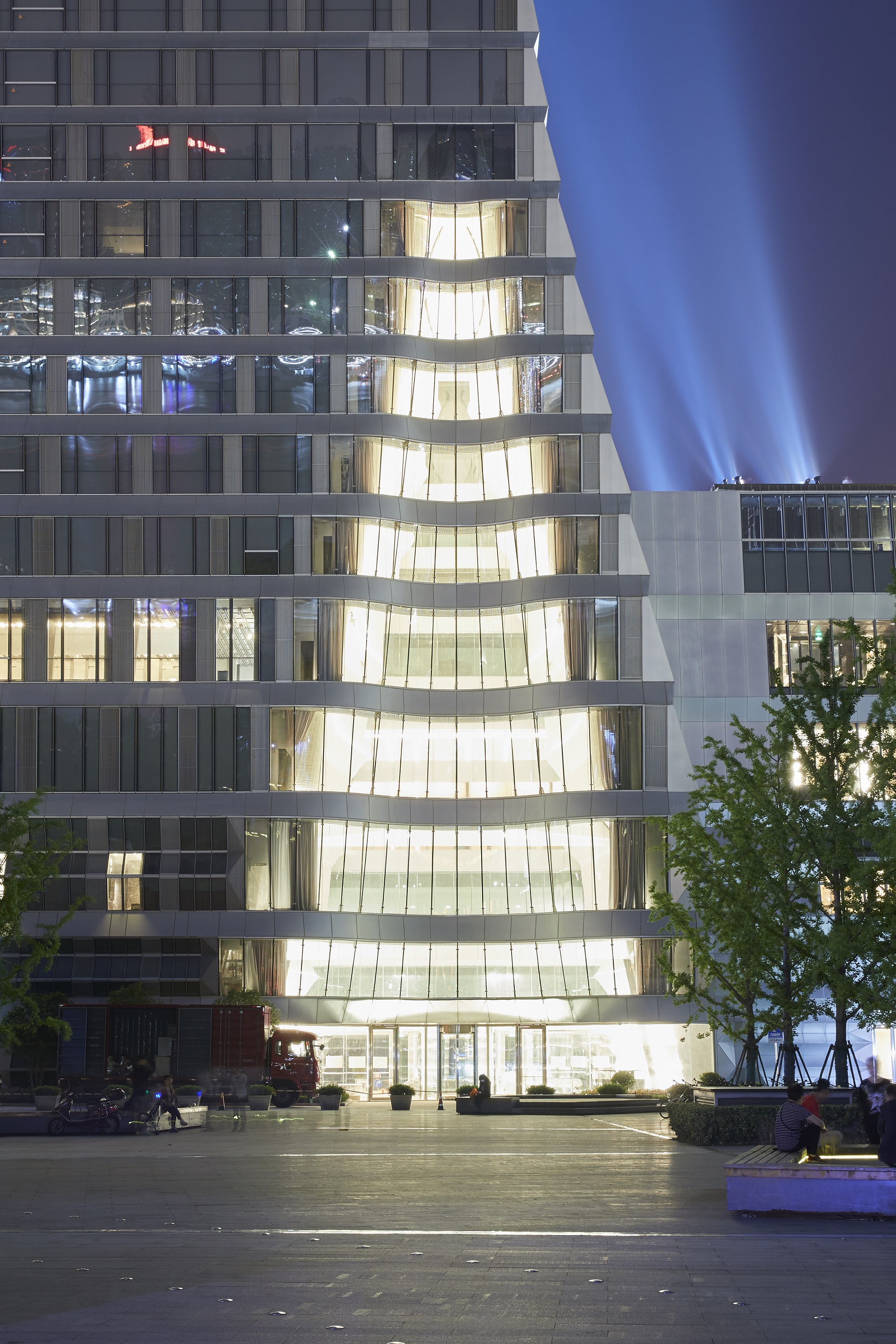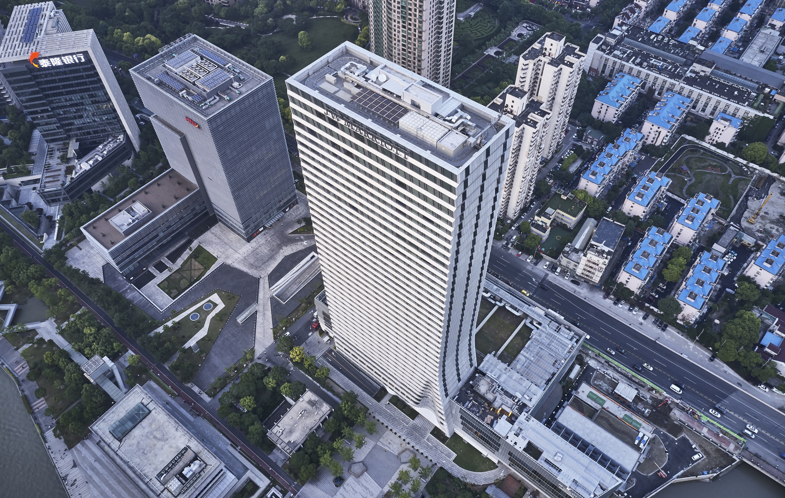 上海魯能JW萬豪侯爵酒店是繼邁阿密、迪拜之后,全球第三間、中國第一間JW萬豪侯爵酒店,總建筑面積約11.4萬㎡,地上39層,地下4層,建筑高度157.5m。酒店建筑設(shè)計(jì)與迪拜塔師出同門,由著名的美國SOM建筑設(shè)計(jì)事務(wù)所操刀設(shè)計(jì)。整體設(shè)計(jì)以周圍環(huán)境為靈感,廣泛使用水及波紋元素,在外立面將多個(gè)對稱幾何空間打造為一體,以層疊感來詮釋簡潔流暢的建筑美學(xué),呈現(xiàn)的是恰到好處的溫柔。酒店大堂采用A字型設(shè)計(jì),高60米,相當(dāng)于近20層民用建筑的高度,內(nèi)向傾斜角度達(dá)到79度,并有弧形與直線的相互變化,整體觀感氣勢恢弘。