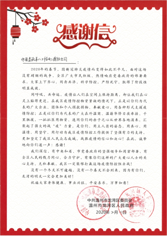 3月2日,中共溫州市龍灣區(qū)委、溫州市龍灣區(qū)人民政府向溫州高新文化廣場項目發(fā)來感謝信,對項目在春節(jié)期間在新冠病毒疫情防控上所做出的貢獻表示感謝。