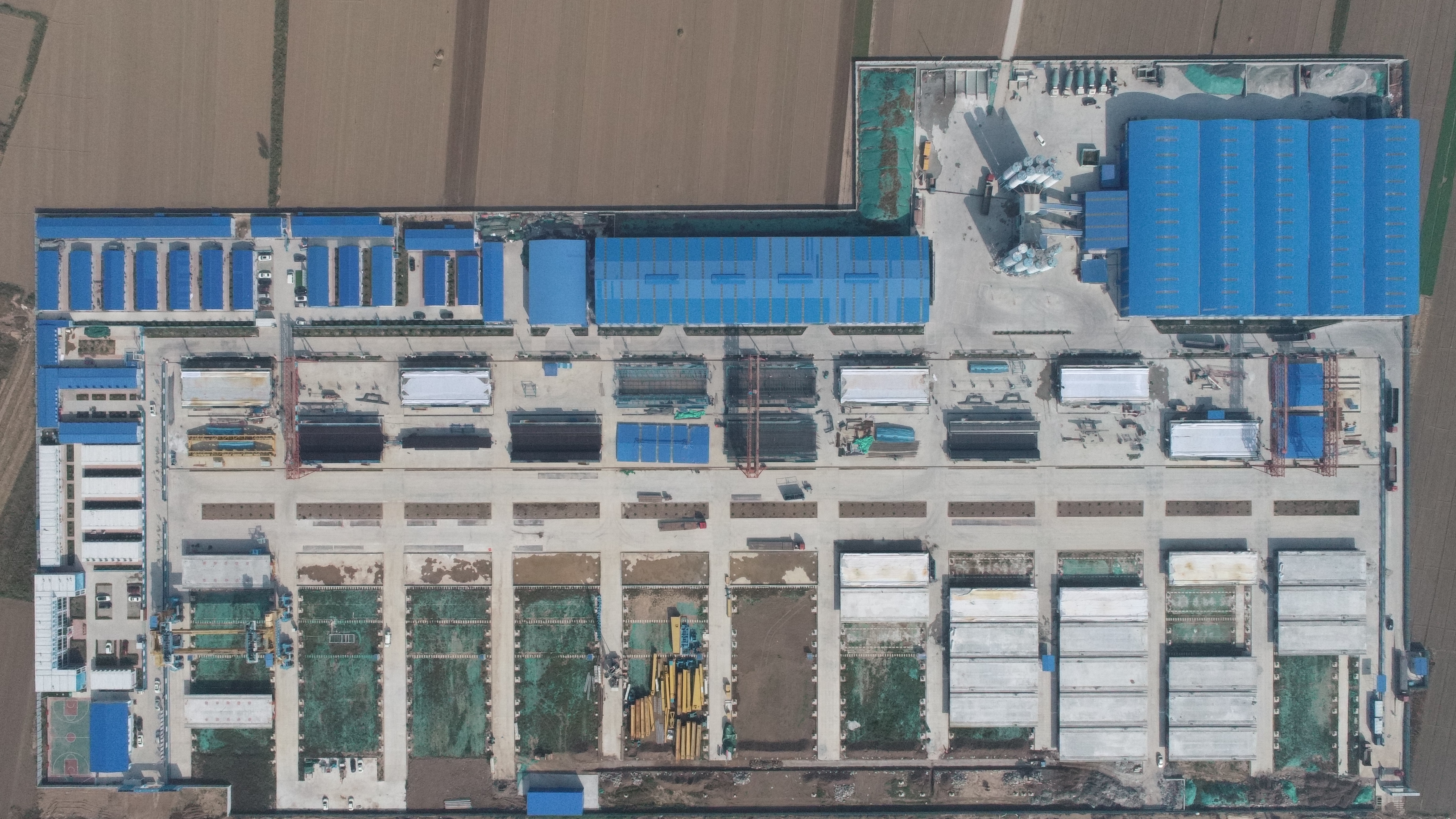 聊城東制梁場占地約195畝,相當于18個標準足球場面積,主要包括混凝土拌和站、鋼筋加工場、物資庫房、制梁區(qū)、存梁區(qū)、提梁上橋區(qū)等功能區(qū)。聊城東梁場單月制梁最多可達到45孔,最大存梁能力為132孔。為確保一次性通過認證、保質保量進行箱梁批量生產(chǎn),聊城東制梁場制定了詳細的工作計劃,嚴格把控鋼筋加工安裝、混凝土澆筑、張拉壓漿、移存梁等關鍵工序。