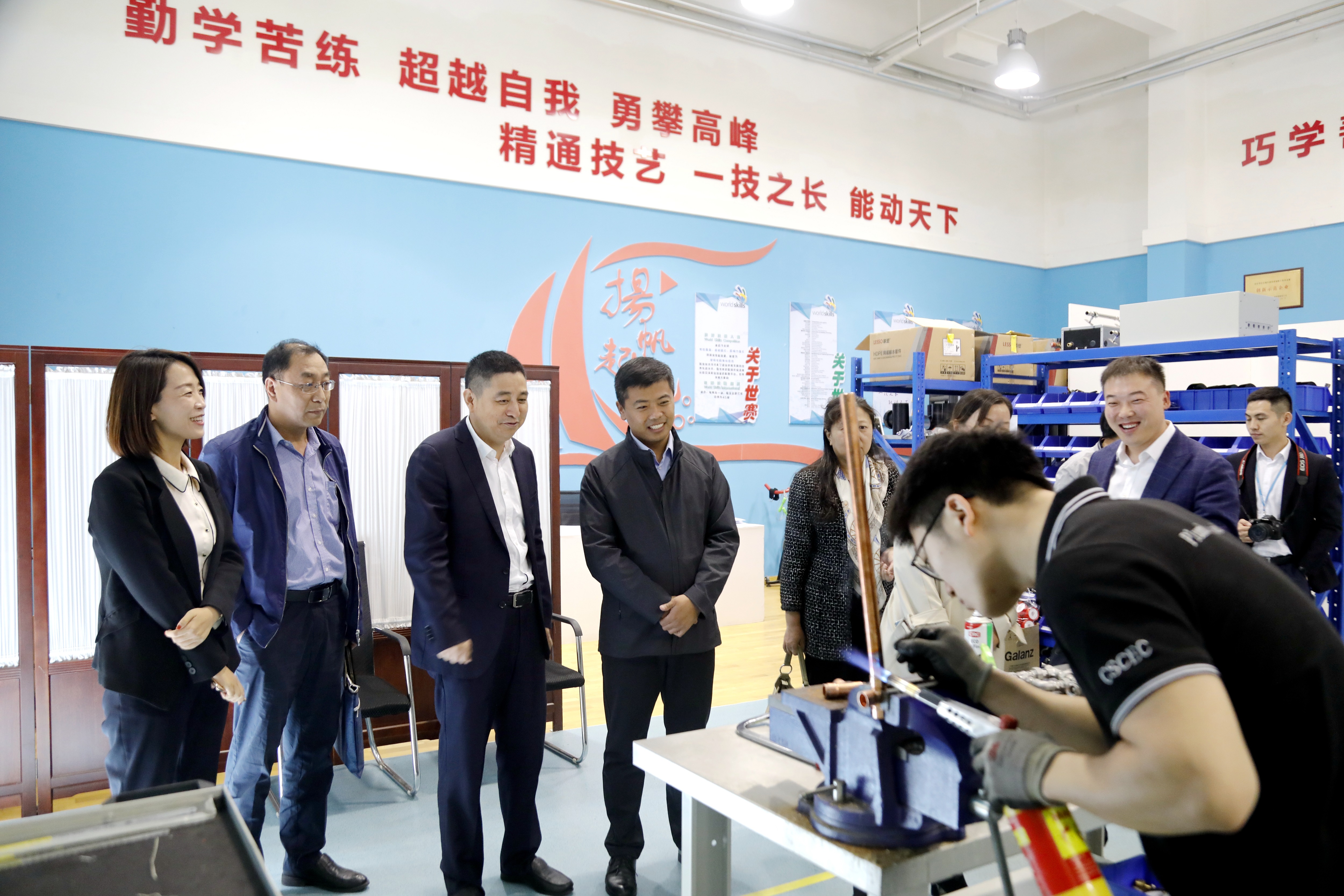 活動中考察組還參觀了企業(yè)文化展館并查看了陳宇航工匠人才創(chuàng)新工作室(第46屆世界技能大賽“管道與制暖”項目實訓(xùn)基地)。95后“小工匠”的現(xiàn)場演示令考察組對工作室產(chǎn)生了濃郁的興趣,領(lǐng)導(dǎo)們紛紛上前了解并與其深入交流,鼓勵并祝愿其能夠抓住創(chuàng)新工作室平臺,在即將到來的世賽全國選拔賽中取得好成績!