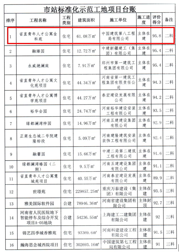 12月15日,河南省直青年人才公寓金科苑項(xiàng)目榮獲鄭州市建筑工程質(zhì)量標(biāo)準(zhǔn)化示范工地認(rèn)定第一名。