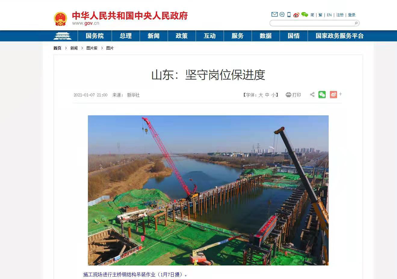 1月7日,聊城市黑龍江路跨徒駭河大橋,在-19℃嚴寒中進行了首次鋼結(jié)構(gòu)主縱梁桿件吊裝。當(dāng)晚,國務(wù)院官網(wǎng)點贊中建八一建設(shè)者不畏嚴寒、堅守崗位保證重點民生工程履約推進的事跡。