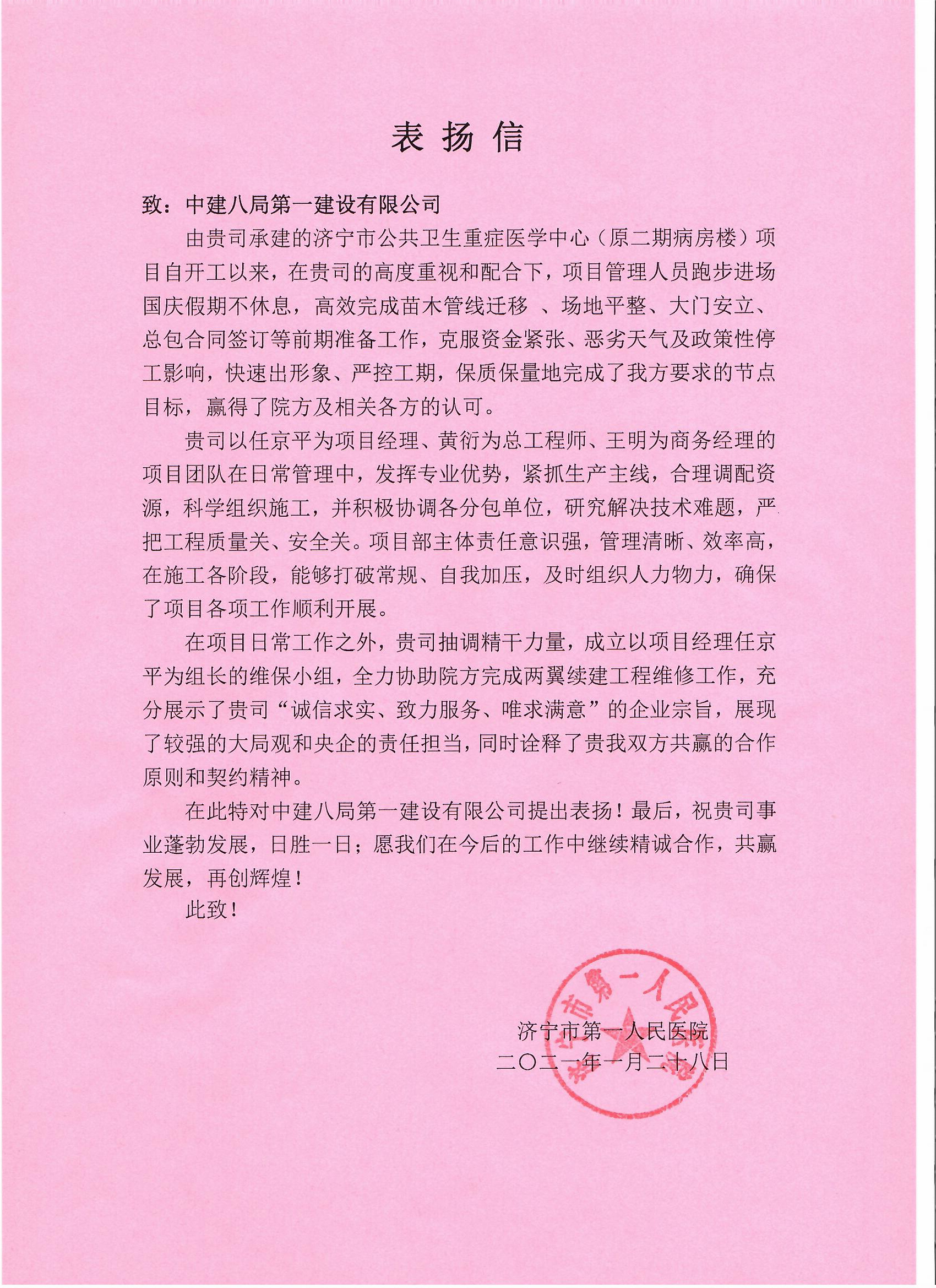 2月1日,濟寧市公共衛(wèi)生重癥醫(yī)學(xué)中心項目部收到來自業(yè)主濟寧市第一人民醫(yī)院的一封表揚信。