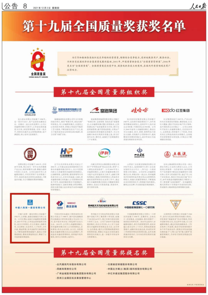 中建八一榮獲“全國(guó)質(zhì)量獎(jiǎng)”!山東唯一建筑企業(yè)!