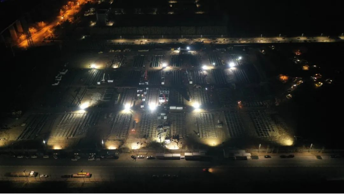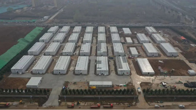 3月19日,各區(qū)域同時開工。10小時完成場地平整3.5萬平方米;20小時完成16棟箱房基礎(chǔ)模板支設(shè);12小時完成基礎(chǔ)混凝土澆筑;6小時完成8900平方米室外道路硬化;48小時完成室外管道鋪設(shè)2800余米;72小時完成892間箱房組裝;48小時完成10萬余米電線電纜鋪設(shè)。28日晚,892間標(biāo)準(zhǔn)箱房全部亮燈;29日,成功交付504套隔離觀察房。