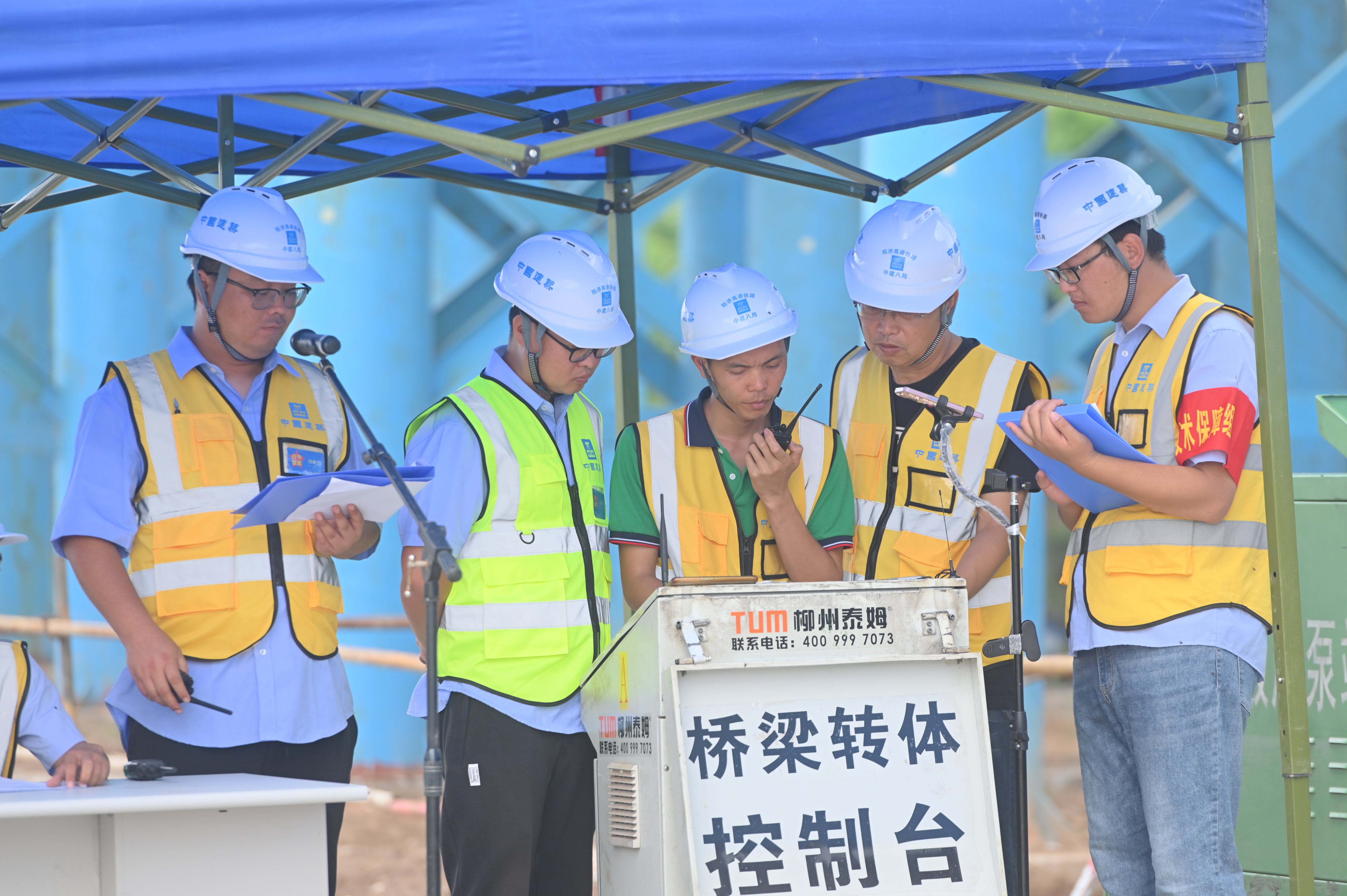 跨京九、邯濟(jì)鐵路(72+128+72)m轉(zhuǎn)體連續(xù)梁全長(zhǎng)273.7米,橋面寬12.6米,主墩高10米,單個(gè)T構(gòu)轉(zhuǎn)體重量11100噸。轉(zhuǎn)體需要兩個(gè)T構(gòu)件“零誤差”合在一起,為實(shí)現(xiàn)精準(zhǔn)對(duì)接,兩個(gè)主墩T構(gòu)分別在兩臺(tái)300噸千斤頂、液壓泵站等轉(zhuǎn)體設(shè)備的牽引下,同步順時(shí)針轉(zhuǎn)體79度,最終完成兩個(gè)“巨無(wú)霸”的合體。