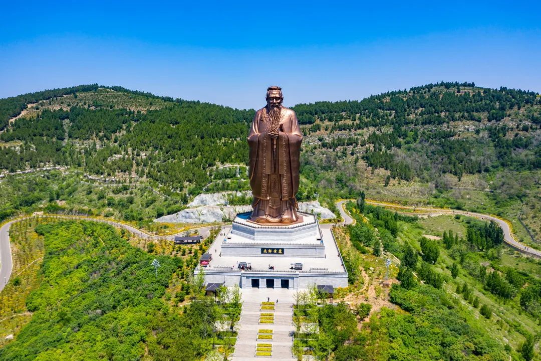 孔子像整體高72米,東西跨度35米,南北寬度30米,像體鋼結(jié)構(gòu)骨架用鋼量600噸,表面黃銅用量150噸,利用大傾角超高超薄銅板施工技術,完美展示了孔子“溫而厲,威而不猛,恭而安”的圣人形象。