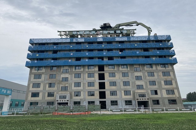 針對(duì)目前預(yù)制構(gòu)件吊裝存在的單件構(gòu)件自重大、吊裝作業(yè)專業(yè)性強(qiáng)、吊裝效率低等問題,中建科技(濟(jì)南)有限公司聯(lián)合山東奧堃智能裝備有限公司共同設(shè)計(jì)研發(fā)“裝配式建筑智能安裝系統(tǒng)”,該系統(tǒng)是安裝在施工層上部的一套可隨著樓層升高自動(dòng)爬升的吊裝裝置,裝置由爬升立柱、軌道梁、折疊式機(jī)械臂、倒運(yùn)小車和懸臂吊機(jī)五部分組成。該系統(tǒng)具有吊裝分離、安全智能、工作平穩(wěn)、適用性強(qiáng)、定位精確、性能優(yōu)越等優(yōu)勢(shì),該系統(tǒng)預(yù)制構(gòu)件最大吊裝重量可達(dá)7.2噸,軌道最大跨度達(dá)24米,機(jī)械臂旋轉(zhuǎn)半徑達(dá)15米,可實(shí)現(xiàn)現(xiàn)場(chǎng)施工安拆方便、效率高、低碳環(huán)保。具體工作流程是:懸臂吊機(jī)將構(gòu)架從樓下提升至倒運(yùn)小車放置架→倒運(yùn)小車將構(gòu)件運(yùn)輸至折疊式機(jī)械臂工作范圍內(nèi)→折疊式機(jī)械臂擺放構(gòu)件并進(jìn)行微調(diào)→預(yù)制構(gòu)件安裝固定→本層全部構(gòu)件安裝完成→自爬立柱頂升,進(jìn)行下一層施工。