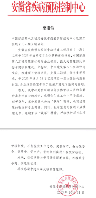 10月31日,安徽省疾病預(yù)防控制中心遷建工程(一期)項(xiàng)目喜獲業(yè)主感謝信,對項(xiàng)目全體管理人員攻堅(jiān)克難、精心策劃,高效推動(dòng)現(xiàn)場施工管理提出認(rèn)可及表揚(yáng)!