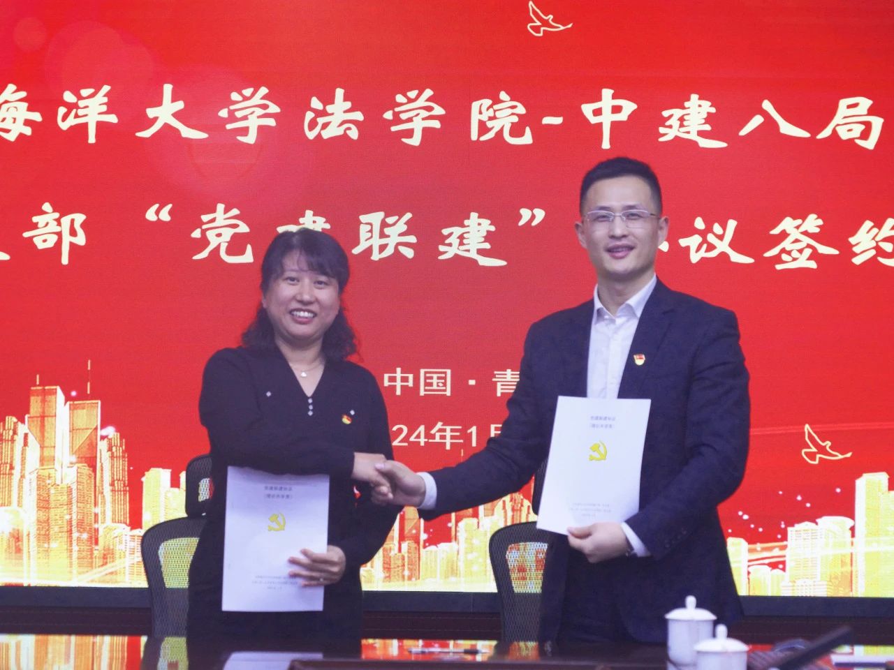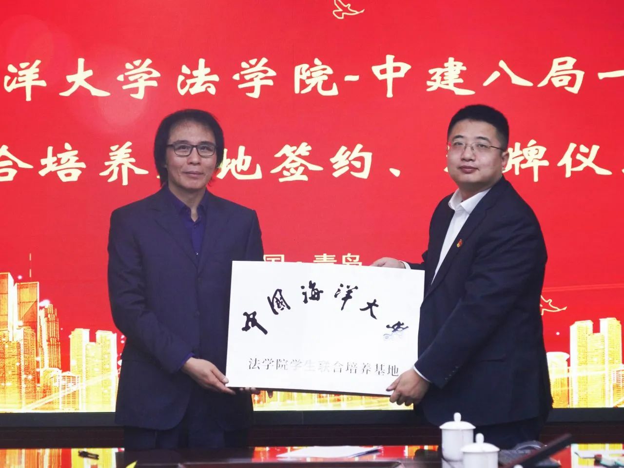 1月8日,中國海洋大學(xué)法學(xué)院與中建八局一公司聯(lián)合培養(yǎng)基地簽約授牌暨黨支部“黨建聯(lián)建”簽約儀式在青島舉行。法學(xué)院黨委書記劉健、院長桑本謙、辦公室主任王雅婕、法碩中心執(zhí)行主任于曉藝;中建八局一公司相關(guān)負(fù)責(zé)人參加。