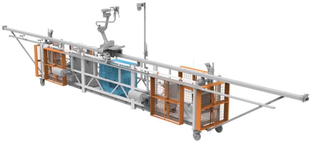 機器人以吊籃模塊為基礎(chǔ)平臺,通過導(dǎo)軌搭載噴涂設(shè)備代替外墻施工人員,減輕人工高強度作業(yè)的負(fù)擔(dān)以及風(fēng)險,同時降低漆霧對人體的傷害。