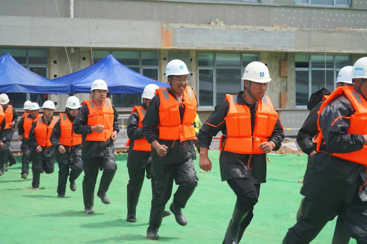 啟動儀式后,項目開展了防臺防汛應急演練。青島市防汛抗旱指揮部、青島市住房和城鄉(xiāng)建設局防汛工作領導小組同時發(fā)布降雨橙色預警,項目部防汛應急小組迅速集結,組織現(xiàn)場巡查,做好應急救援準備。