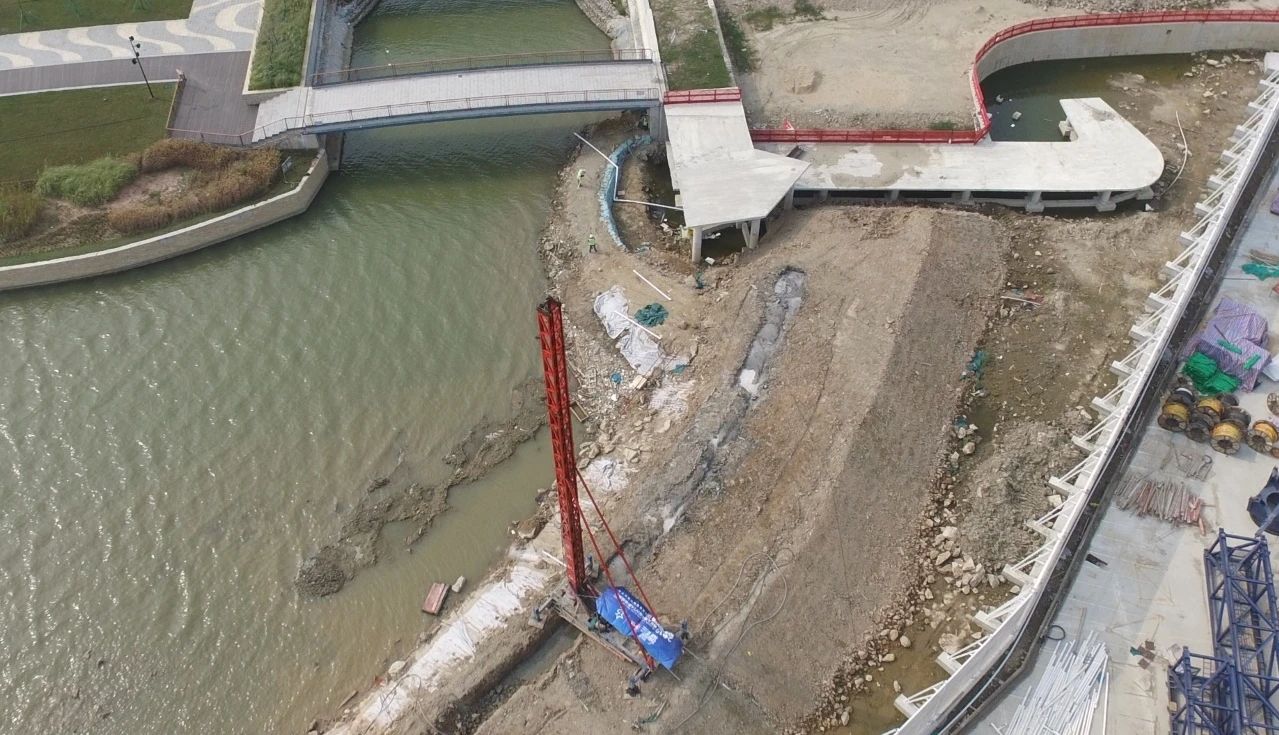 項目位于天沐河中央,屬于人工筑島工程,圍堰承擔著最重要的防水功能,為克服圍堰施工困難,項目團隊研發(fā)水上筑島環(huán)境下圍堰施工關(guān)鍵技術(shù),高效完成圍堰施工。