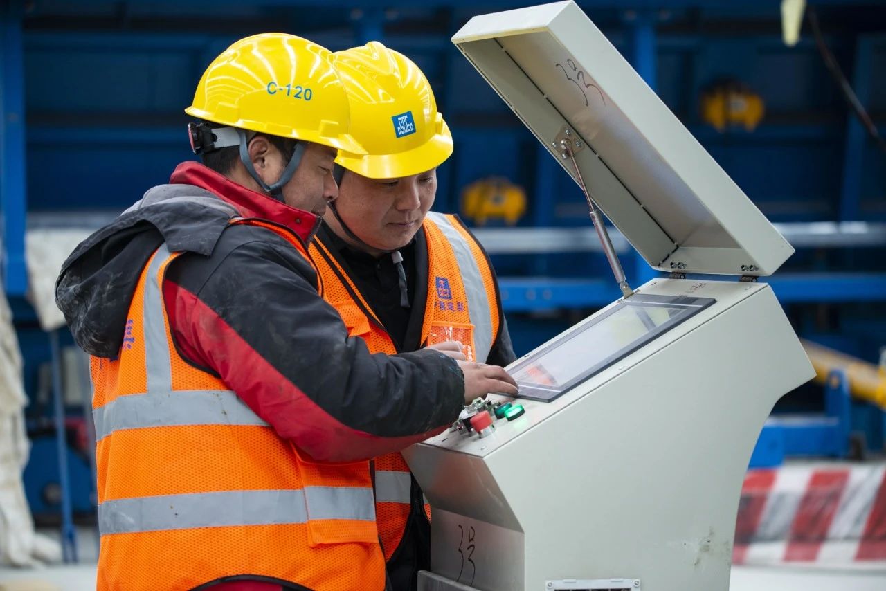 一片長(zhǎng)30米、重約100噸的箱梁從“智慧梁廠”中制作成型需要?dú)v經(jīng)“五步”:第一步,鋼筋塑形將7.4噸的梁板半成品鋼筋放入數(shù)控彎曲中心進(jìn)行加工,2小時(shí)內(nèi)精準(zhǔn)變身成不同型號(hào)的鋼筋成品,提升生產(chǎn)效率與成品質(zhì)量;第二步,綁扎成籠,加工好的鋼筋與穿束波紋管一起在定尺胎架上進(jìn)行可視化綁扎,“編織”形成牢固的成品鋼筋籠,有效克服梁板鋼筋成品工藝復(fù)雜鋼筋間距要求高的難點(diǎn);第三步,放入模具使用10噸吊裝桁架吊具將成品鋼筋籠吊裝至側(cè)模中,引入智能液壓模板系統(tǒng)進(jìn)行合模,操作人數(shù)較傳統(tǒng)模式減少約50%,過程中設(shè)備高精度傳感器,實(shí)時(shí)進(jìn)行檢測(cè),確保安裝精度,保障后期混凝土澆筑無滲漏、錯(cuò)臺(tái);第四步,澆筑成型。精準(zhǔn)控制混凝土配比,是提高梁板成品質(zhì)量的重要前提,通過智能攪拌站的加持,電腦程序可精確計(jì)算所需配比,配合傳感器自動(dòng)調(diào)配混凝土,混凝土澆筑入模具的過程,采用集成振搗系統(tǒng)持續(xù)高頻振搗,振搗時(shí)間及狀態(tài)均能實(shí)時(shí)監(jiān)測(cè),使得澆筑更加均勻、穩(wěn)定;第五步,養(yǎng)護(hù)出場(chǎng)。梁板拆模后乘坐”臺(tái)座小車“移至蒸汽養(yǎng)生房進(jìn)行恒溫蒸養(yǎng),以此達(dá)到彈性模量及強(qiáng)度指標(biāo),采用數(shù)控智能張拉機(jī),實(shí)現(xiàn)預(yù)應(yīng)力參數(shù)精準(zhǔn)控制,張拉完成的箱梁經(jīng)由160噸龍門吊吊裝至壓漿區(qū),通過智能集中壓漿站實(shí)現(xiàn)大批量集中制漿、壓漿,最終經(jīng)過封錨封端后,一片優(yōu)質(zhì)的箱梁就此誕生。