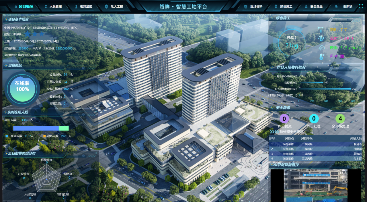 中國(guó)中醫(yī)科學(xué)院廣安門醫(yī)院濟(jì)南醫(yī)院項(xiàng)目應(yīng)用公司自主研發(fā)的瓴眸·智慧工地平臺(tái),構(gòu)建“大型醫(yī)療工程全過(guò)程智慧管理系統(tǒng)”,通過(guò)移動(dòng)互聯(lián)、物聯(lián)網(wǎng)、云計(jì)算大數(shù)據(jù)等新一代信息技術(shù),形成危大工程監(jiān)管、現(xiàn)場(chǎng)物料管理、安全隱患排查等“6+4+N”智慧管理成果,實(shí)現(xiàn)智能化、網(wǎng)絡(luò)化、數(shù)據(jù)化現(xiàn)場(chǎng)管控。