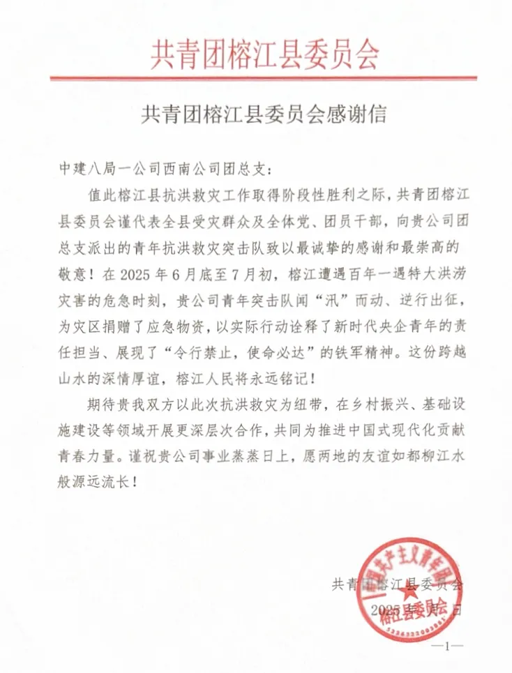 經(jīng)過幾天奮戰(zhàn),突擊隊圓滿完成任務(wù)。撤離前,榕江縣村民與當(dāng)?shù)仄髽I(yè)自發(fā)組織晚會,為各位志愿者送上象征“喜慶、吉祥、圓滿”的“紅雞蛋”,以表示感謝。共青團榕江縣委員會送來感謝信,對八局一公司的央企擔(dān)當(dāng)、鐵軍作風(fēng)表示認可。