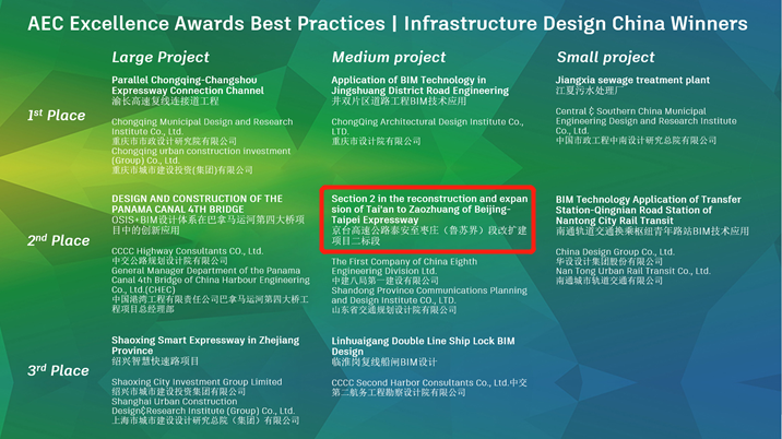 12月25日,2020全球工程建設(shè)業(yè)卓越BIM大賽最佳應(yīng)用實踐項目獲獎名單揭曉,京臺高速改擴建項目二標段所提交的項目榮獲基礎(chǔ)設(shè)施設(shè)計類別中型項目組最佳實踐獎第二名。