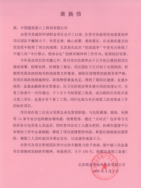 4月12日,中國(guó)中醫(yī)科學(xué)院廣安門(mén)醫(yī)院項(xiàng)目部喜獲業(yè)主單位北京廣安順元醫(yī)藥有限公司發(fā)來(lái)的表?yè)P(yáng)信,業(yè)主單位對(duì)項(xiàng)目部在在疫情期間防控工作、組織復(fù)工等方面的展現(xiàn)出來(lái)的“令行禁止 使命必達(dá)”的鐵軍精神表示高度的認(rèn)可。