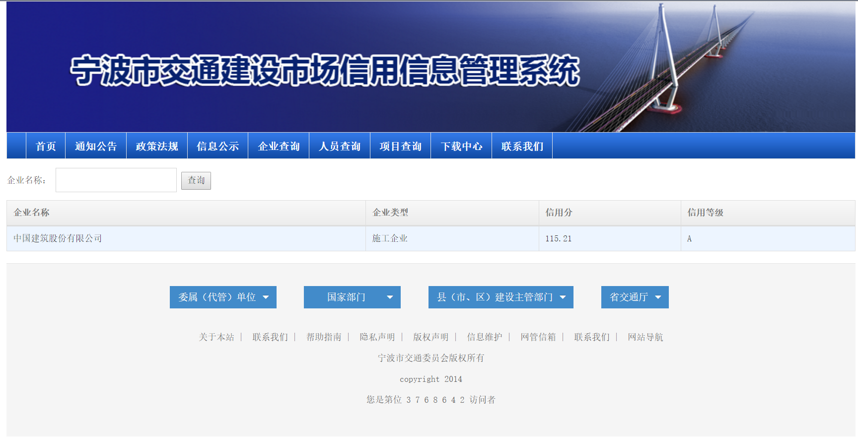 2020年中國(guó)建筑股份有限公司在寧波交通建設(shè)信用信息管理系統(tǒng)中信用分為115.