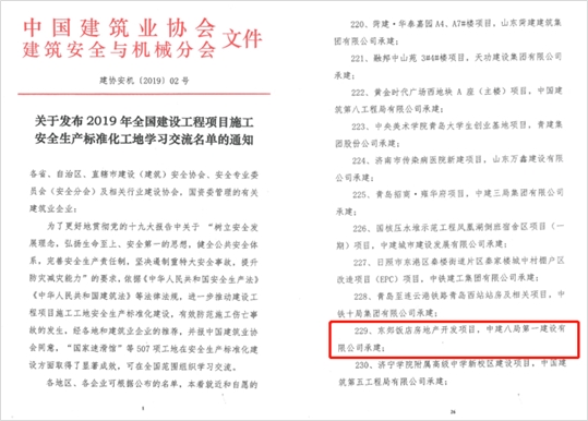 2019年年末之際,東郊飯店房地產(chǎn)開發(fā)項(xiàng)目喜訊頻傳,先后榮獲2019年度“全國建設(shè)工程項(xiàng)目施工安全生產(chǎn)標(biāo)準(zhǔn)化工地”、 “全國安全管理標(biāo)準(zhǔn)化示范班組” 兩項(xiàng)國家級安全管理榮譽(yù)。