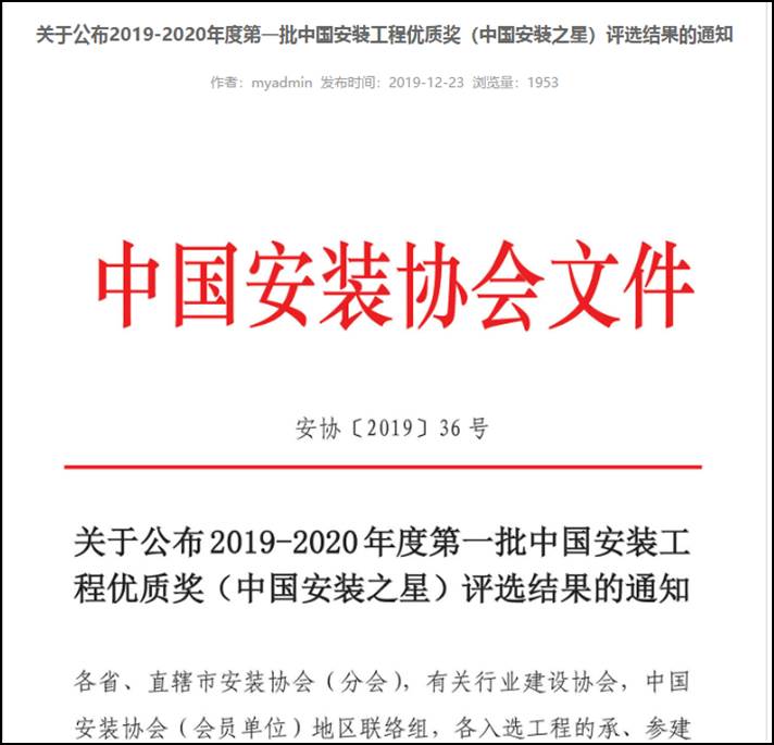 安裝公司兩項(xiàng)工程榮獲中國安裝工程質(zhì)量最高獎“中國安裝之星”