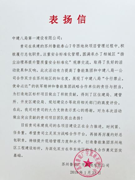 近日,蘇地2016-WG-57號(hào)西地塊項(xiàng)目收到魯能廣宇置業(yè)有限公司對(duì)項(xiàng)目部的表?yè)P(yáng)信,信中對(duì)公司工程施工給予了高度評(píng)價(jià)及肯定,并對(duì)項(xiàng)目團(tuán)隊(duì)的團(tuán)結(jié)協(xié)作提出表?yè)P(yáng)。