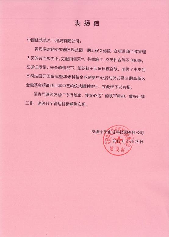 中安創(chuàng)谷科技園一期工程2標(biāo)段項(xiàng)目獲業(yè)主表?yè)P(yáng)信