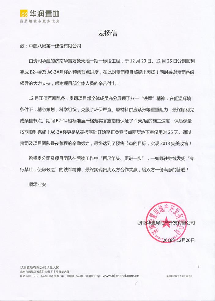 近日,濟(jì)南華置萬象天地項(xiàng)目一期一標(biāo)段總承包工程收到濟(jì)南華置房地產(chǎn)開發(fā)有限公司發(fā)來的表揚(yáng)信,信中對(duì)一公司、濟(jì)南公司各級(jí)領(lǐng)導(dǎo)的大力支持及項(xiàng)目部管理人員在搶工期間攻堅(jiān)克難和不畏勞苦的精神提出了表揚(yáng),并對(duì)項(xiàng)目管理團(tuán)隊(duì)給予了充分肯定。