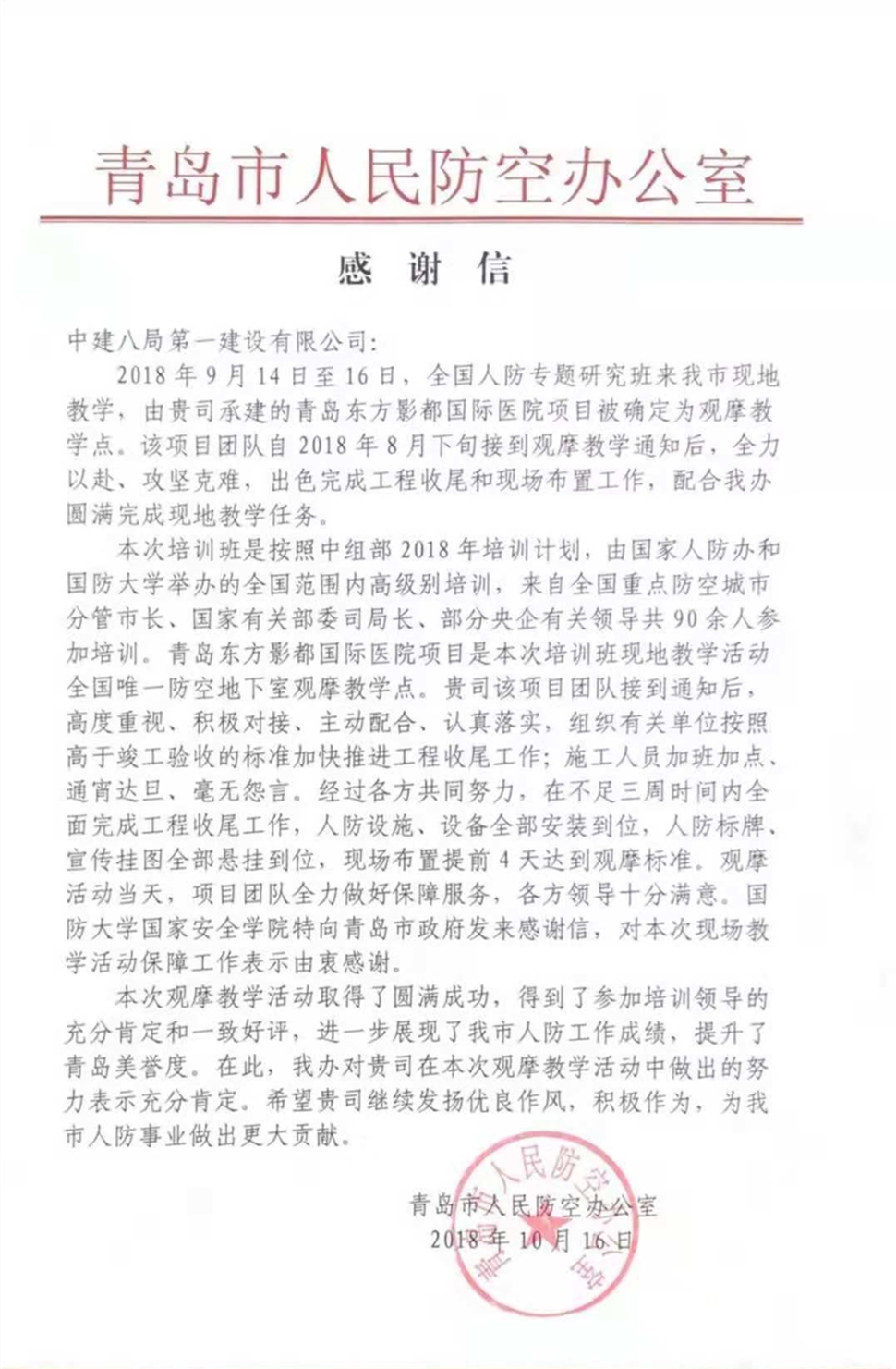 近日,青島萬達東方影都國際學(xué)校、醫(yī)院項目部收到了青島市人民防空辦公室發(fā)來的表揚信。