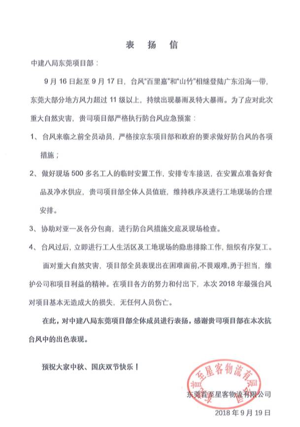 近期,東莞京東項目接到來自業(yè)主東莞首至星客物流有限公司的表揚信,對項目部全體成員應對超強臺風“山竹”的出色表現(xiàn)進行表揚及感謝。