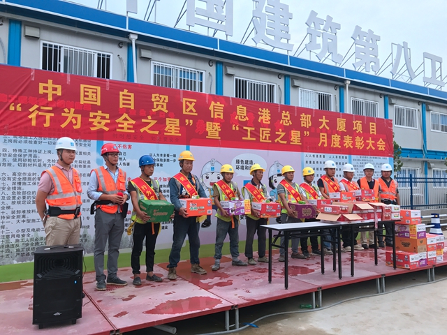 公司中國自貿(mào)區(qū)信息港總部大廈項(xiàng)目舉行“行為安全之星”暨“工匠之星”月度表彰大會
