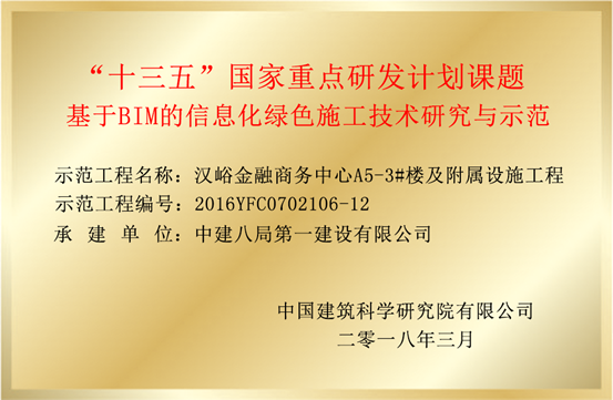 8月15日,漢峪金融商務(wù)中心A5-3#樓及附屬設(shè)施工程“雙喜臨門”,由中國建筑科學(xué)研究院頒發(fā)的“十三五”國家重點(diǎn)研發(fā)計(jì)劃課題《基于BIM的信息化綠色施工技術(shù)研究與示范》銅牌和中建八局頒發(fā)的“二0一八年度科技成果轉(zhuǎn)化示范工程”銅牌在我項(xiàng)目成功掛牌立項(xiàng)。