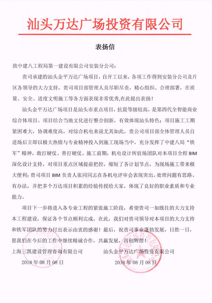 公司安裝公司汕頭金平萬達(dá)項(xiàng)目收到業(yè)主表揚(yáng)信