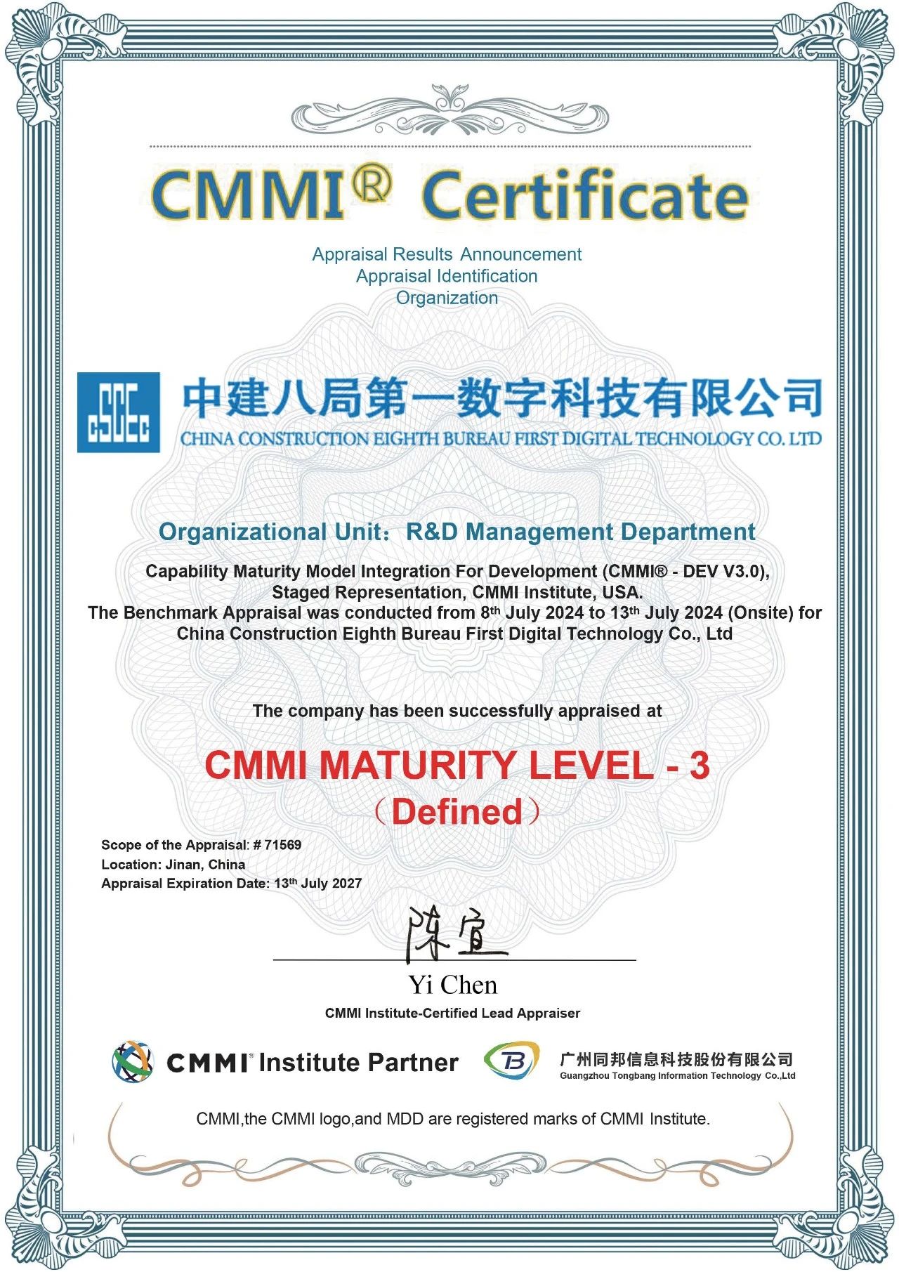 中建八局第一數(shù)字科技有限公司通過CMMI-3級(jí)認(rèn)證