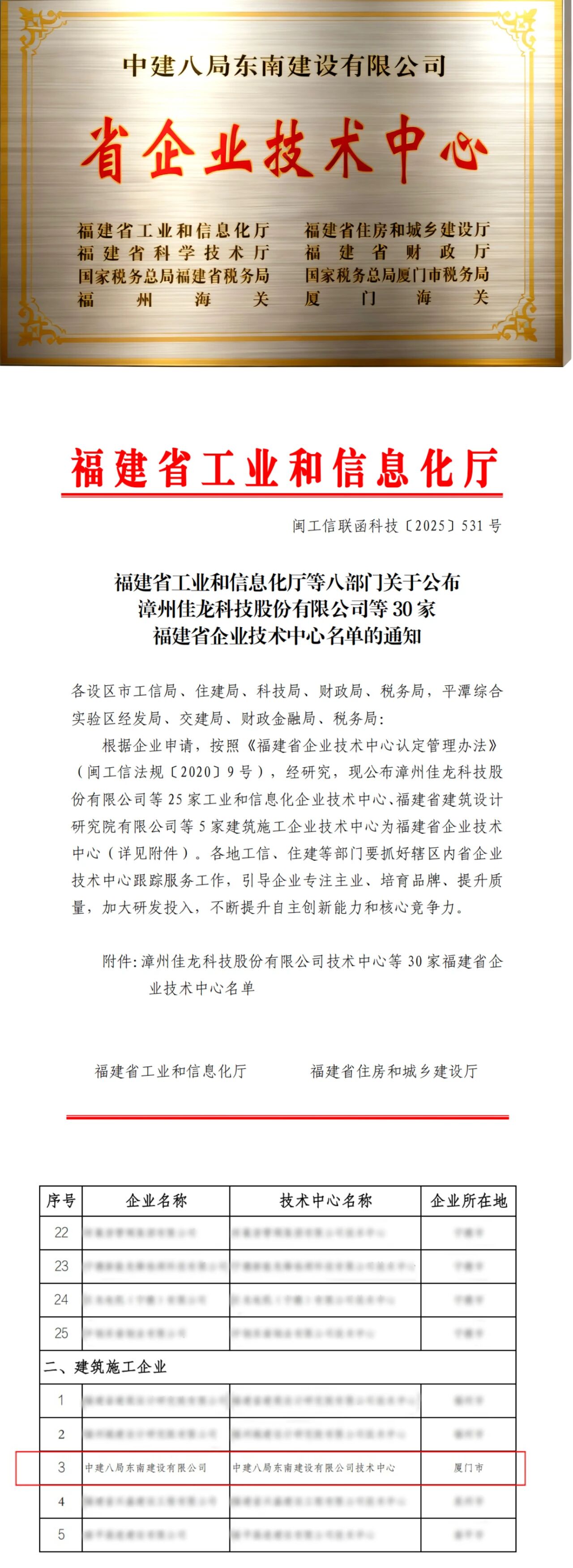 近日,經(jīng)福建省工信廳、省住建廳、省科技廳等八部門(mén)聯(lián)合認(rèn)定,中建八局東南建設(shè)有限公司成功獲批 “福建省企業(yè)技術(shù)中心”,成為此次通過(guò)認(rèn)定的 5 家建筑業(yè)企業(yè)之一,彰顯了其在智能建造、綠色施工等領(lǐng)域的核心研發(fā)實(shí)力與創(chuàng)新競(jìng)爭(zhēng)力。